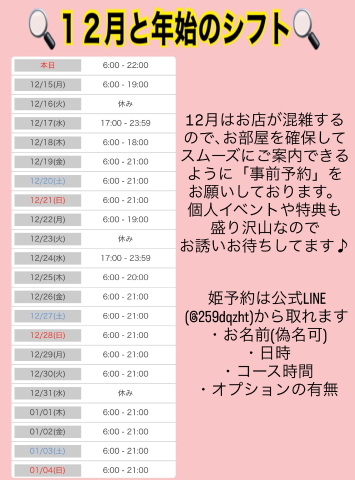 当日の姫予約はご来店の2、3時間前までに